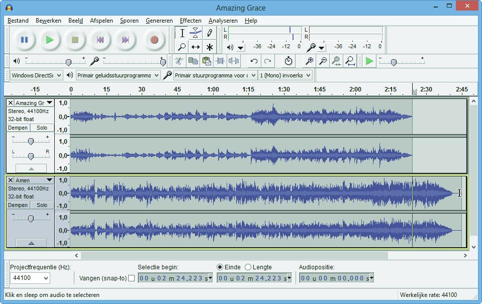 7 Het tweede spoor zal je nu moeten opschuiven tot aan het begin van de Fade-out van het vorige nummer. Gebruik hiervoor het gereedschap ‘Tijd verschuiven‘ uit de Tools werkbalk ( ):